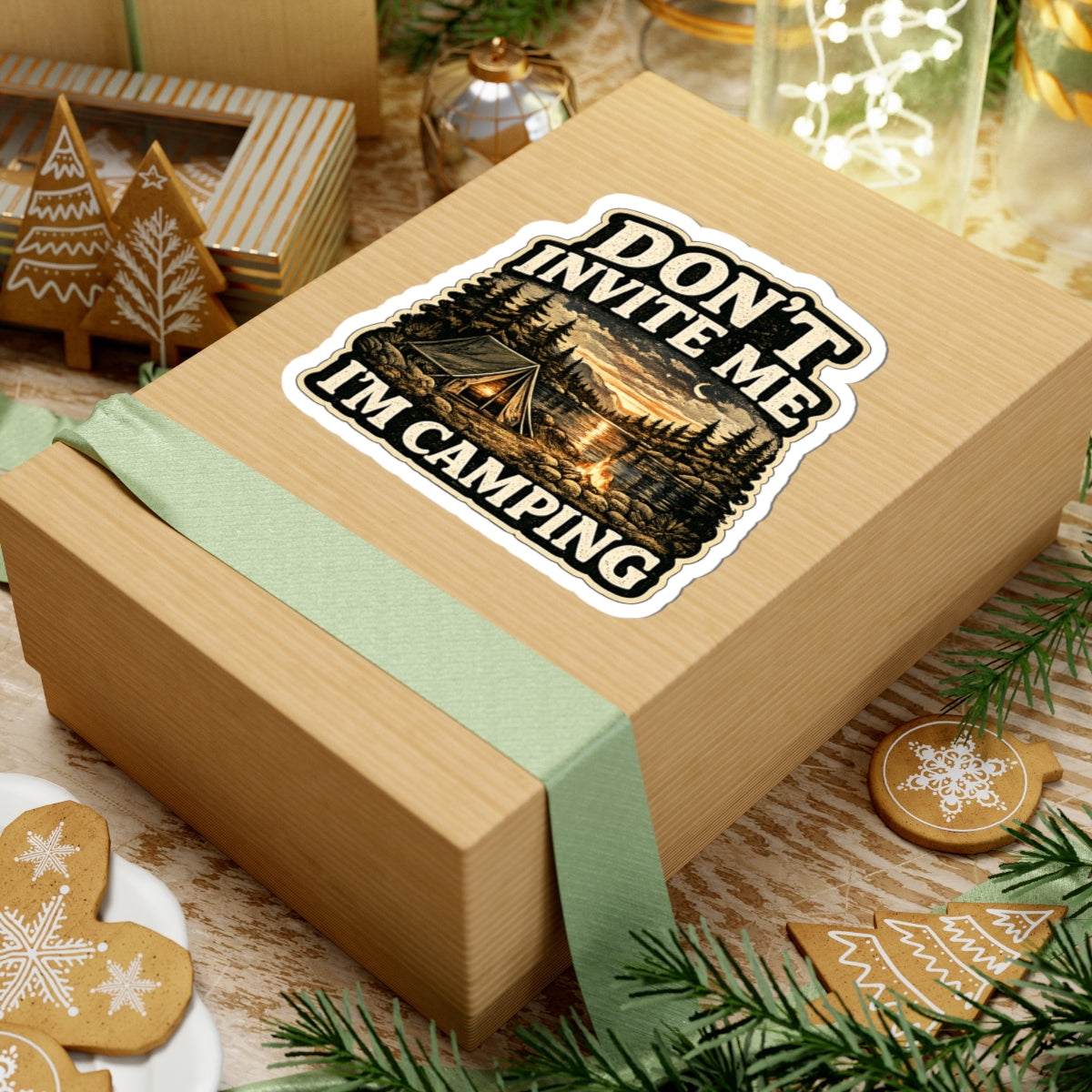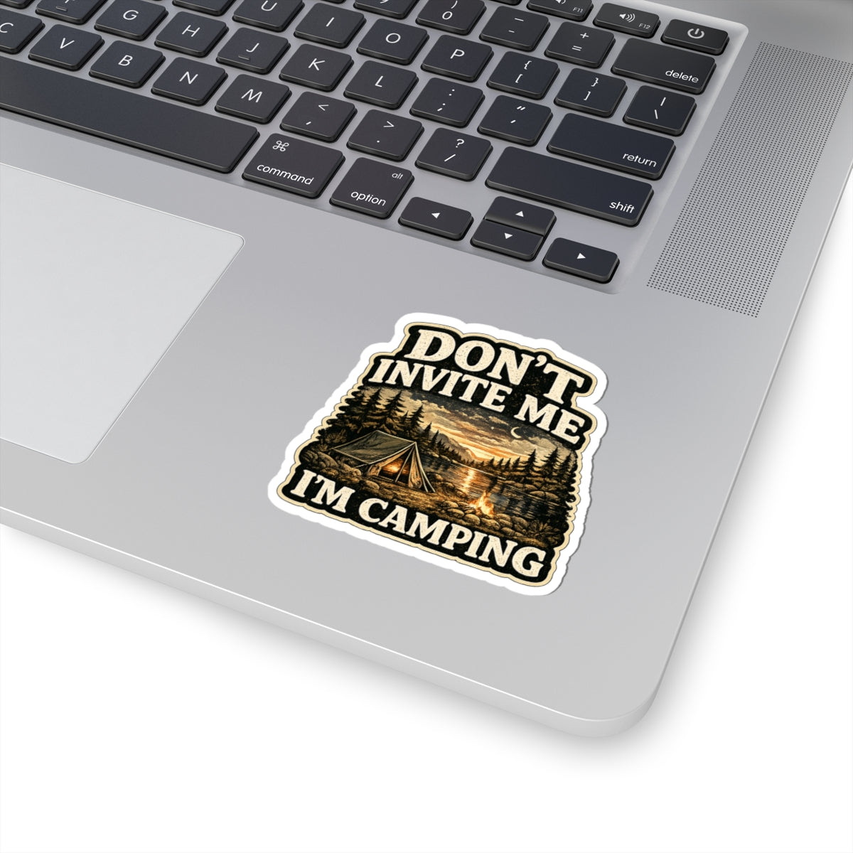 A rugged, nostalgia-tinged camping sticker that speaks to anyone who’d rather be under the stars than at a party. The warm, vintage color palette frames a peaceful campsite beside a moonlit lake — a tent, crackling campfire, and tall pines set beneath hand-drawn typography that reads “Don’t Invite Me — I’m Camping.” It feels like the quiet pull of a lakeside evening: the smell of pine, the hush of water, and the small, steady comfort of the fire. Stick it on a laptop, water-resistant journal, or travel case to quietly declare your love of lone nights outdoors and slow weekend escapes.