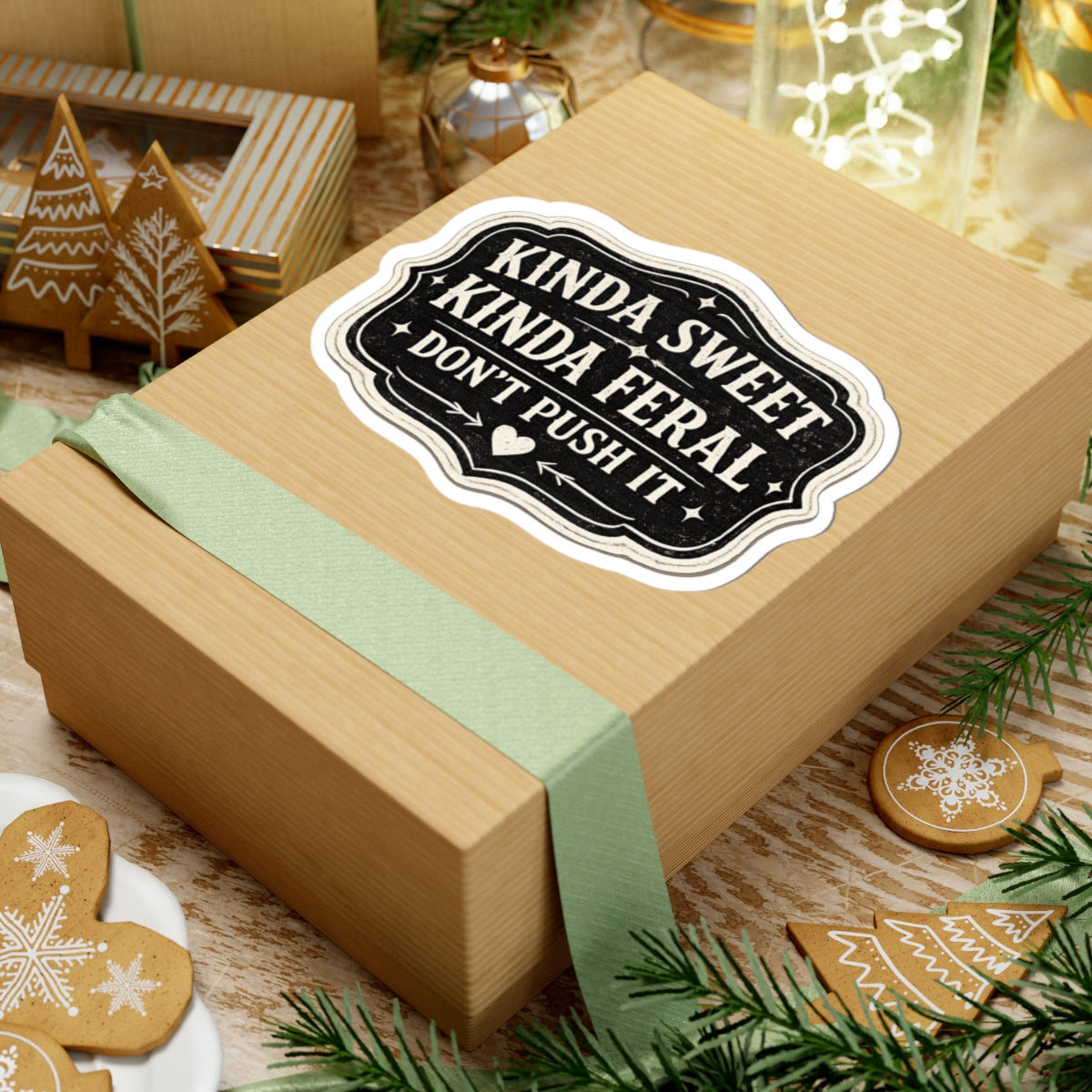 A cheeky, vintage-style kiss-cut sticker that speaks with equal parts sweetness and sass. The distressed black-and-cream design reads “Kinda Sweet Kinda Feral — Don’t Push It,” framed in an ornate label shape with tiny decorative stars and a heart. It sticks cleanly to laptops, journals, water-resistant cases, and other smooth flat surfaces, bringing personality without bulk. The glossy finish catches light while protecting against scratches, and the kiss-cut edge makes peeling and placement effortless. Comes in white or transparent background options and multiple sizes to fit your space.
